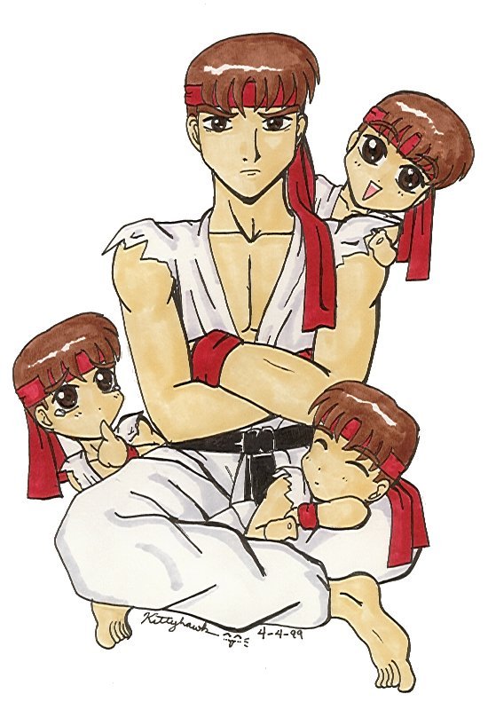 Four! Dimensions: 550 x 800 Size: 87KB Medium: Prismacolor markers Created: 4-4-1999 I made this fanpic for Cathy H. because she asked a whole bunch of fanartists to draw Ryu from Street Fighter 2 for her page. I love the SD Ryu pictured to the left. ^_^ |